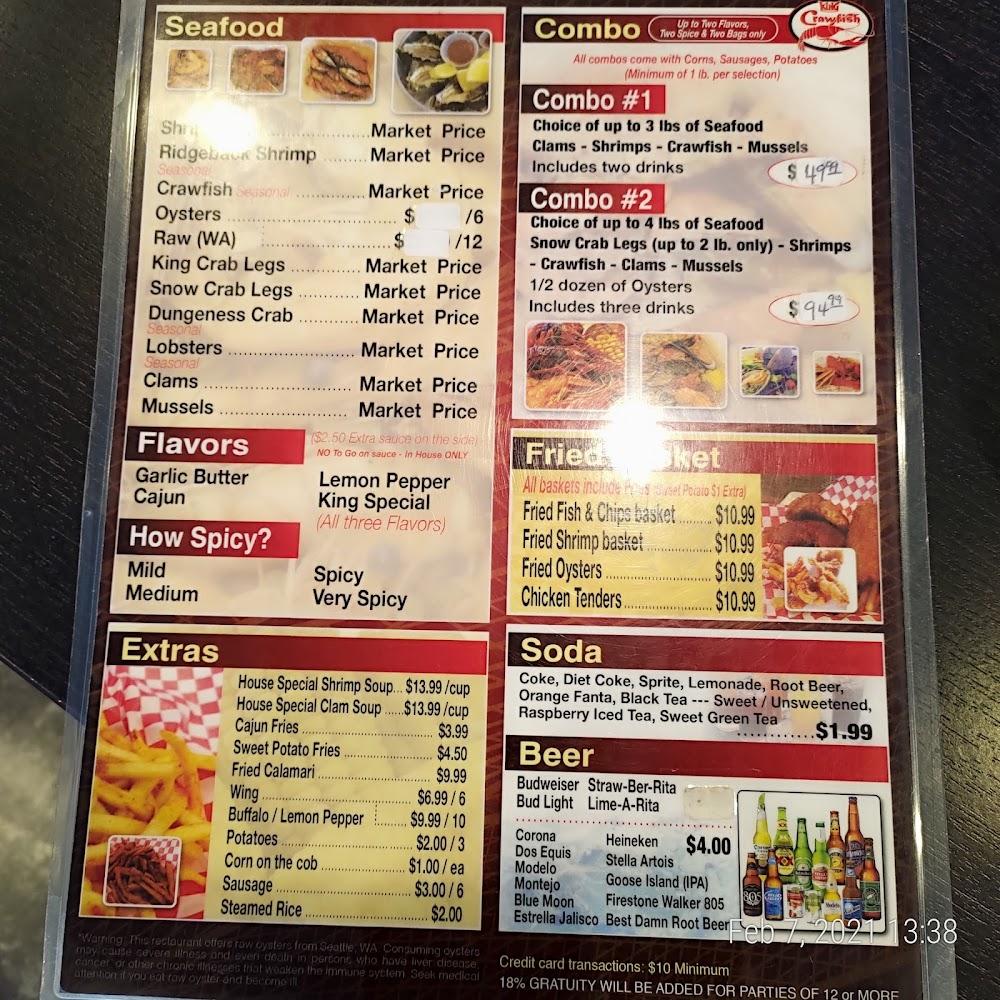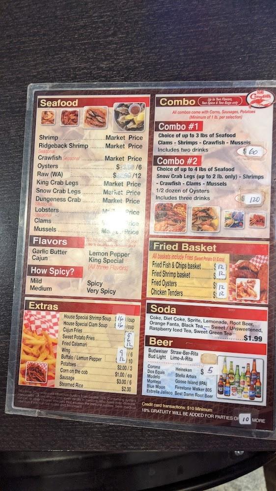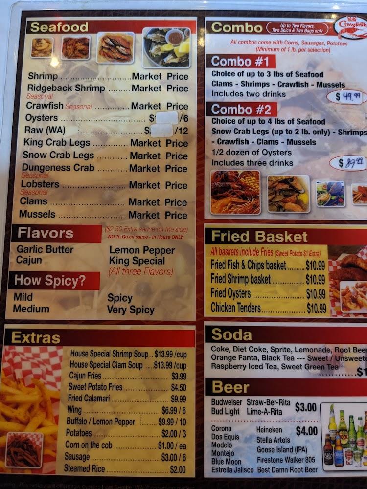 The King Crawfish features an extensive seafood menu focusing on freshness. Signature dishes include the popular shrimp, crawfish, and king crab legs. The combo meals are a highlight, allowing diners to mix and match seafood options with sides like potatoes and corn. Fried baskets also entice with choices of fish, shrimp, and chicken tenders. For a unique twist, try the house special soups, rich in flavor. Their beverage selection includes various local beers, perfect for pairing with your meal. Each dish emphasizes simple, traditional flavors, making it a local hit.